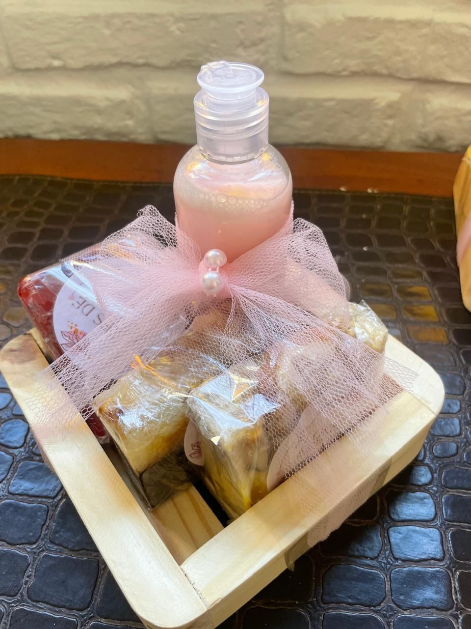 combo de jabón líquido: rosas, lavanda, coco y vainilla mas 3 jabones: sandía y coco, limón y coco, calendula- manzanilla, café, miel, coco /coco, carbón activado/arroz y avena mas jabonera de madera.